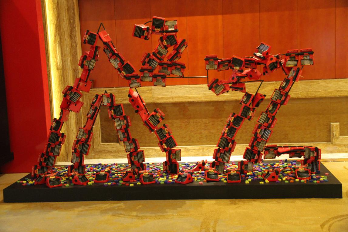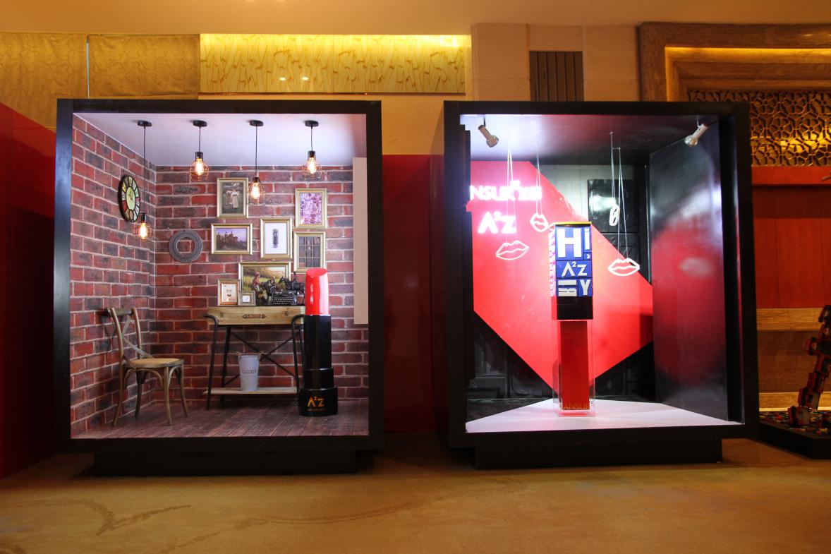 走過漫時(shí)空底妝主題區(qū),來到A2Z唇部新品展,色調(diào)立馬活躍了起來,紅黑組合,讓整個(gè)展覽充滿現(xiàn)代感。字母作為整個(gè)展館的關(guān)鍵元素貫穿其中,要說最顯眼的設(shè)計(jì),莫過于那個(gè)大型A2Z logo了,用近100臺(tái)打字機(jī)組合而成,以最直觀的形式突出口紅與打字機(jī)的關(guān)系。