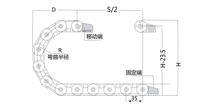 節(jié)距=35mm,每米節(jié)數(shù)=29,鏈長(zhǎng)=S/2+K,S=行程距離,K=π.R+"安全量"